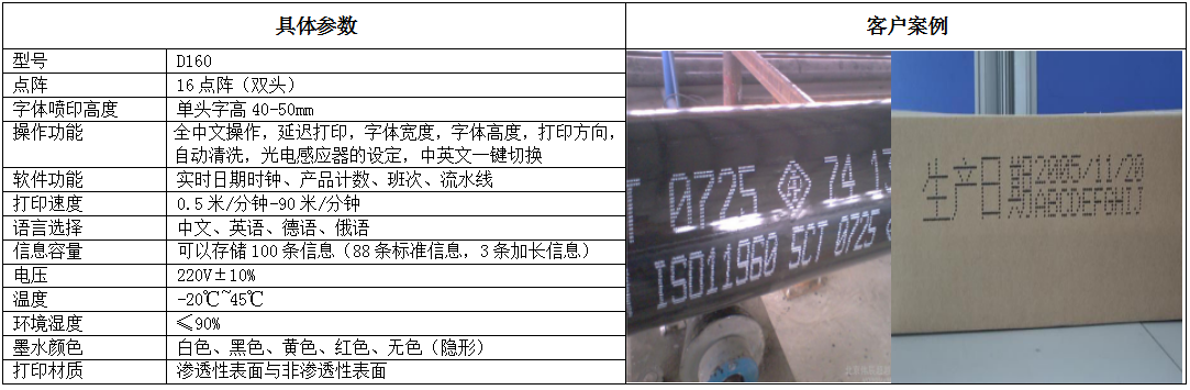 D160大字符噴碼機(jī)特點(diǎn)* 外觀經(jīng)典,時(shí)尚實(shí)用 * 寶石噴片,堅(jiān)固耐用 * 字高11~20000mm可選 * 可選配單機(jī)或多臺(tái)組合